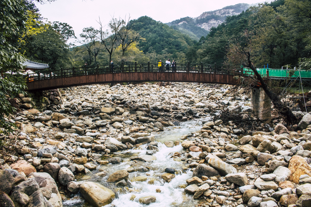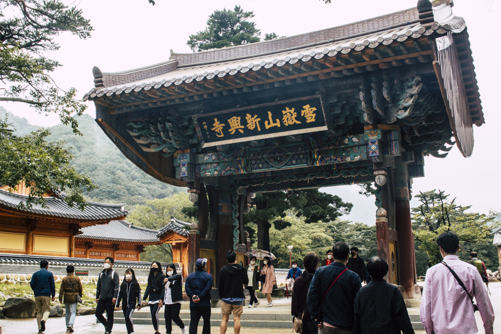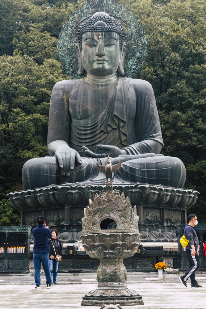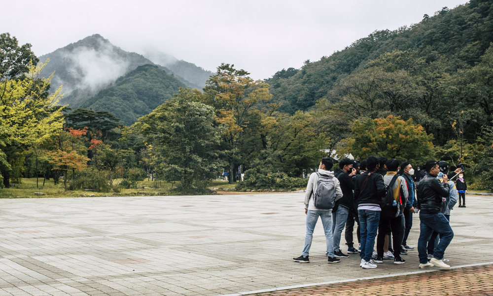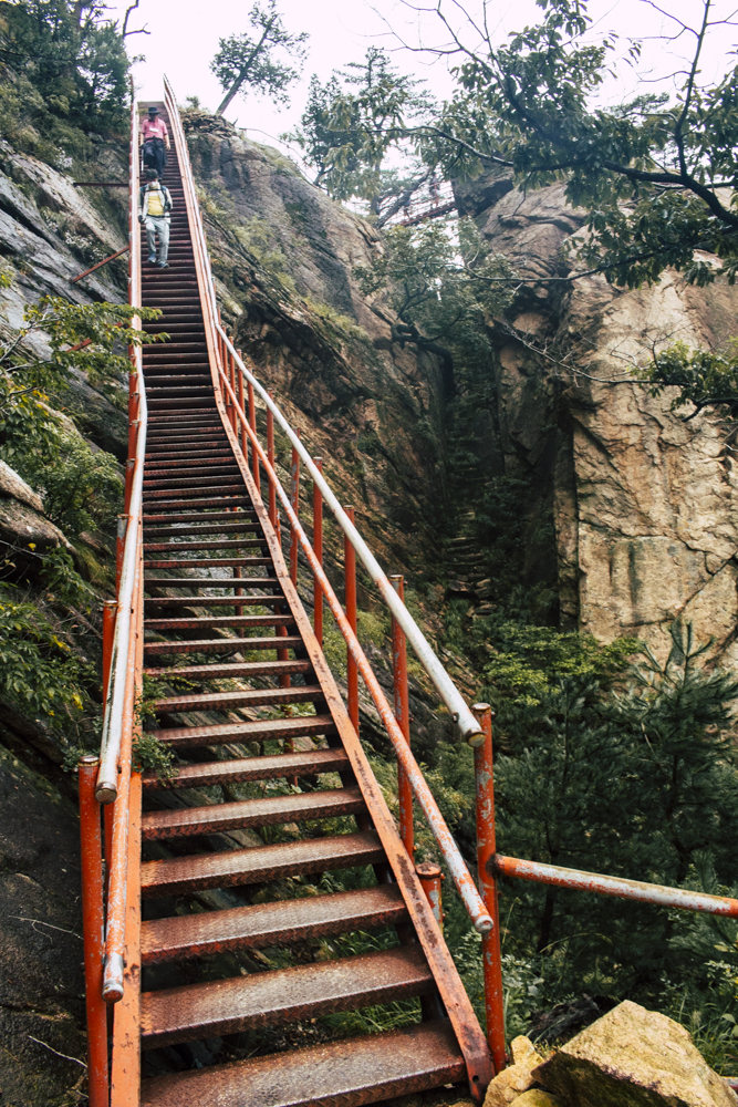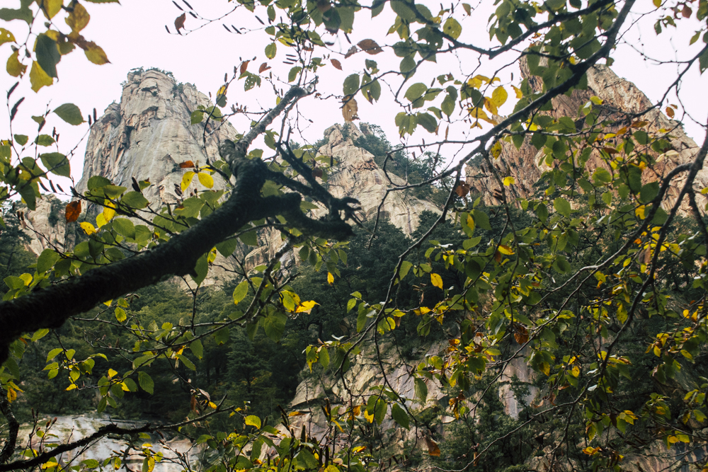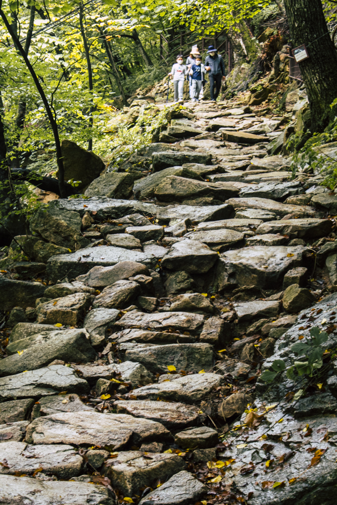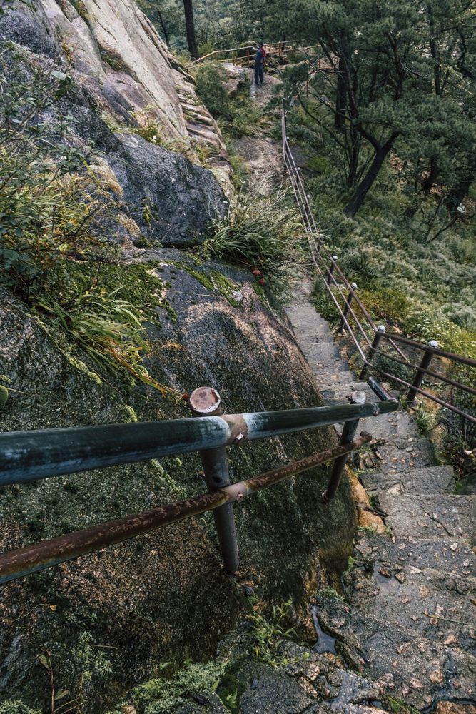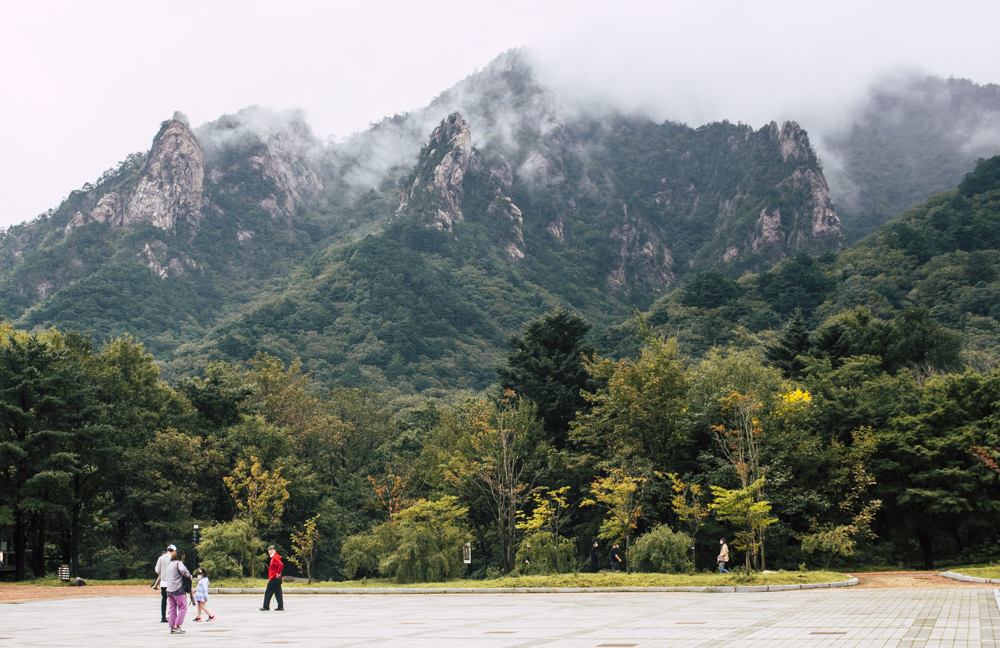 I’ve seen two moods of Seoraksan, grey and sun-drenched. The first of my three-day visit to this northeastern national park had coolish hiking air and mist in the peaks while the second and final were blue-skied and bright. It’s hard not to be awed, from well before the front gate where your car or bus will inch along in a single lane of traffic. Easy enough to disembark public transport and hoof the 20 or 30 minutes to the entrance. A mask rule was in effect to no one’s surprise, but past an outdoor lobby of cafes, restaurants and the bronze Unification Buddha and into the forest trails, where bodies spread out, that loosened. The 2000-plus occupants of these forest canopies were difficult to see. I spotted a lone chipmunk and several steely blue beetles. Flora is an entirely different story as the early autumn greens, yellows and browns were everywhere. There are information plaques spaced along the trails and I pretended to educate myself, about what bark causes inflammation and what mushrooms can potentially end life.
