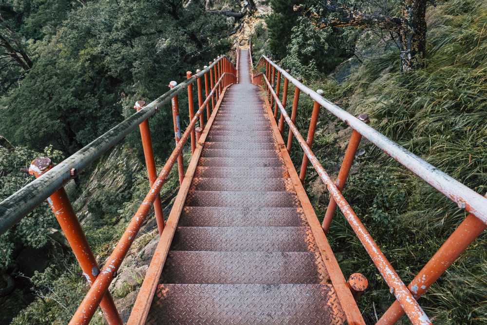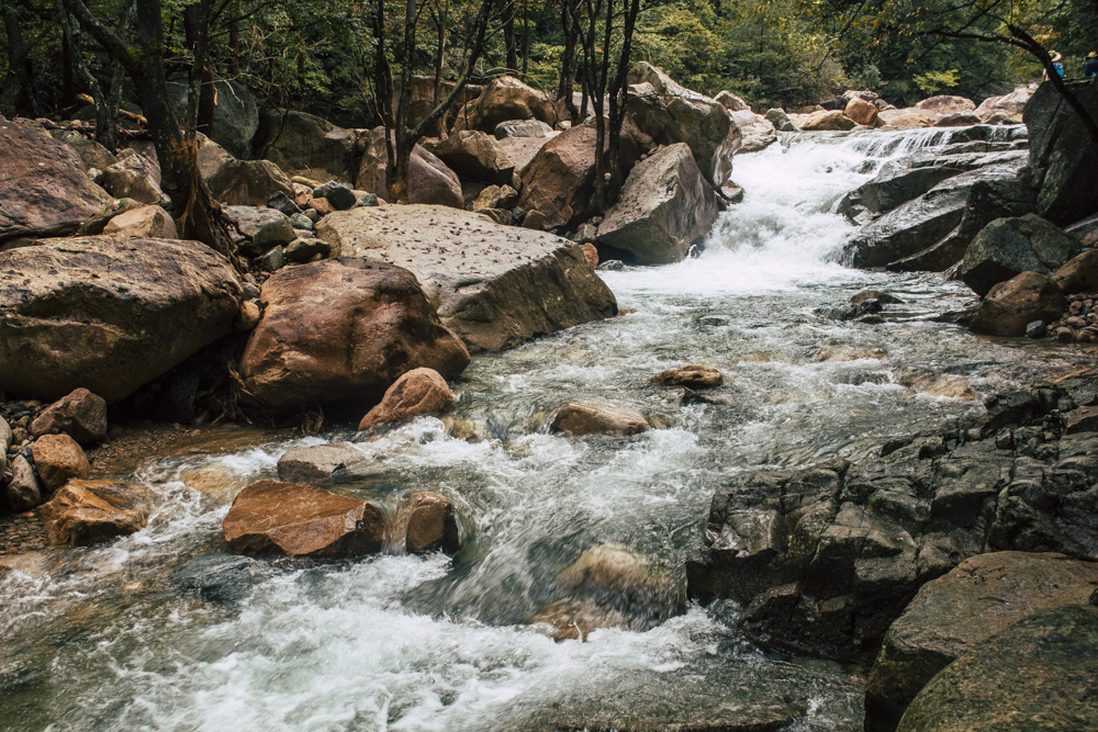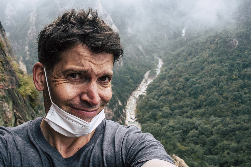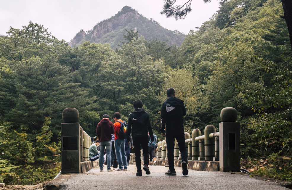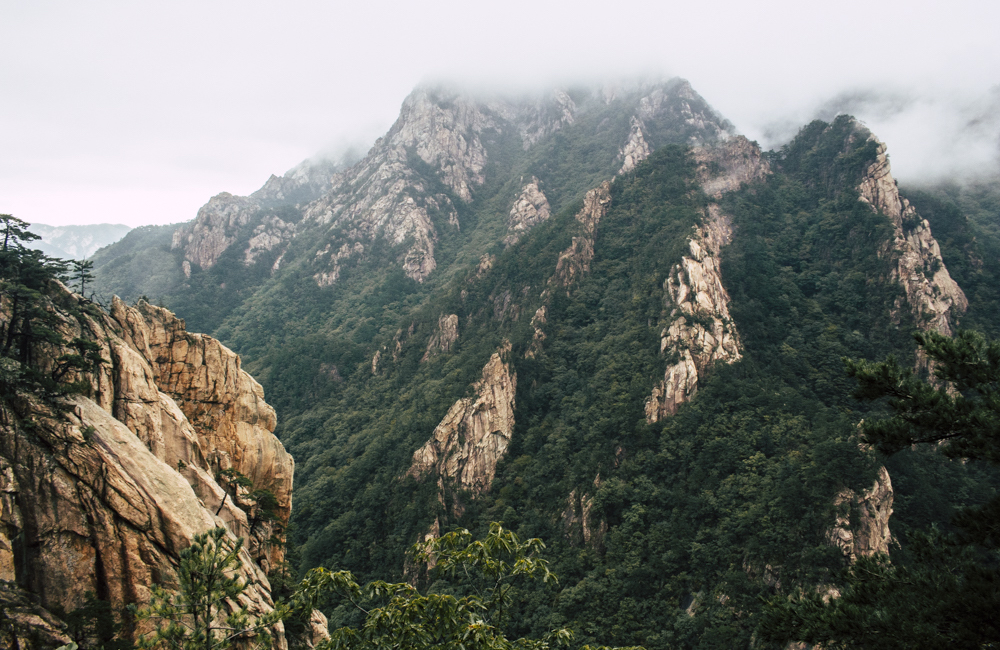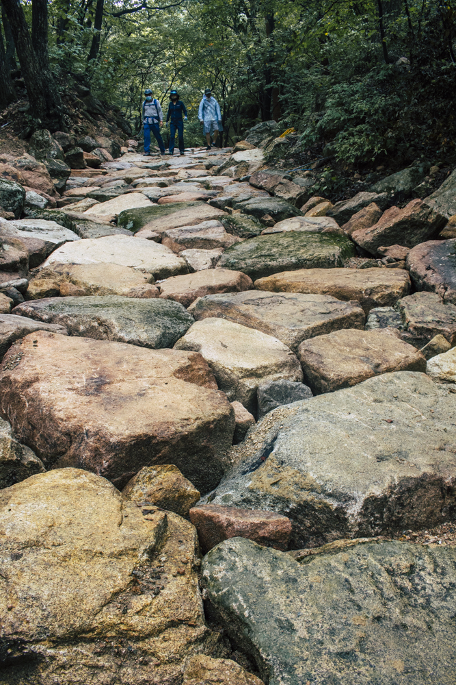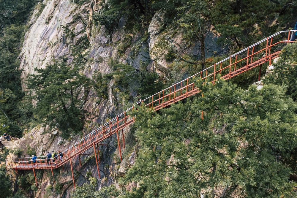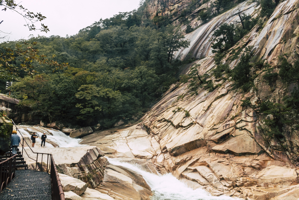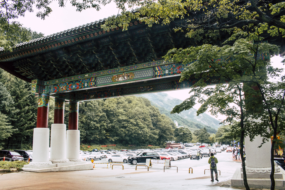 I’ve seen two moods of Seoraksan, grey and sun-drenched. The first of my three-day visit to this northeastern national park had coolish hiking air and mist in the peaks while the second and final were blue-skied and bright. It’s hard not to be awed, from well before the front gate where your car or bus will inch along in a single lane of traffic. Easy enough to disembark public transport and hoof the 20 or 30 minutes to the entrance. A mask rule was in effect to no one’s surprise, but past an outdoor lobby of cafes, restaurants and the bronze Unification Buddha and into the forest trails, where bodies spread out, that loosened. The 2000-plus occupants of these forest canopies were difficult to see. I spotted a lone chipmunk and several steely blue beetles. Flora is an entirely different story as the early autumn greens, yellows and browns were everywhere. There are information plaques spaced along the trails and I pretended to educate myself, about what bark causes inflammation and what mushrooms can potentially end life.