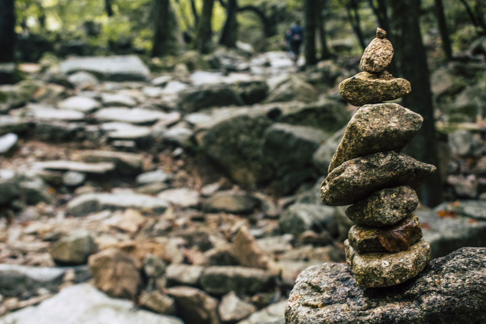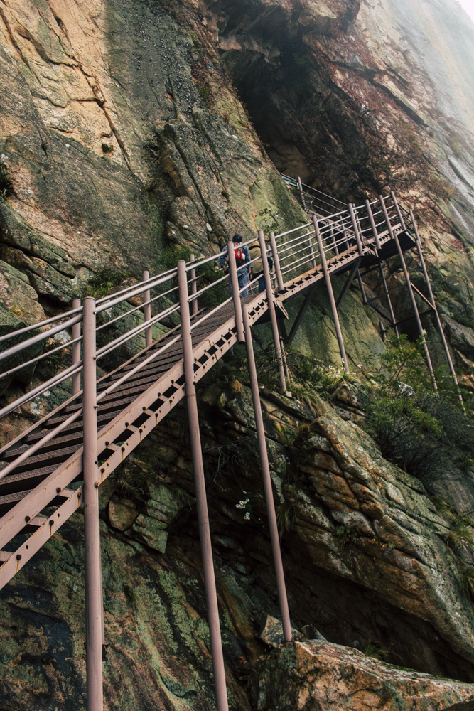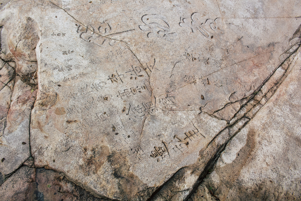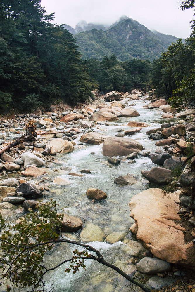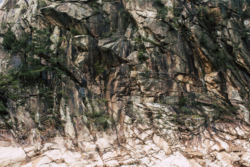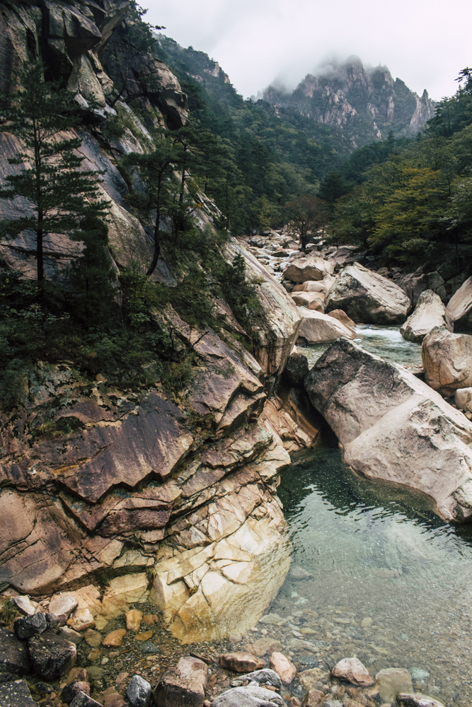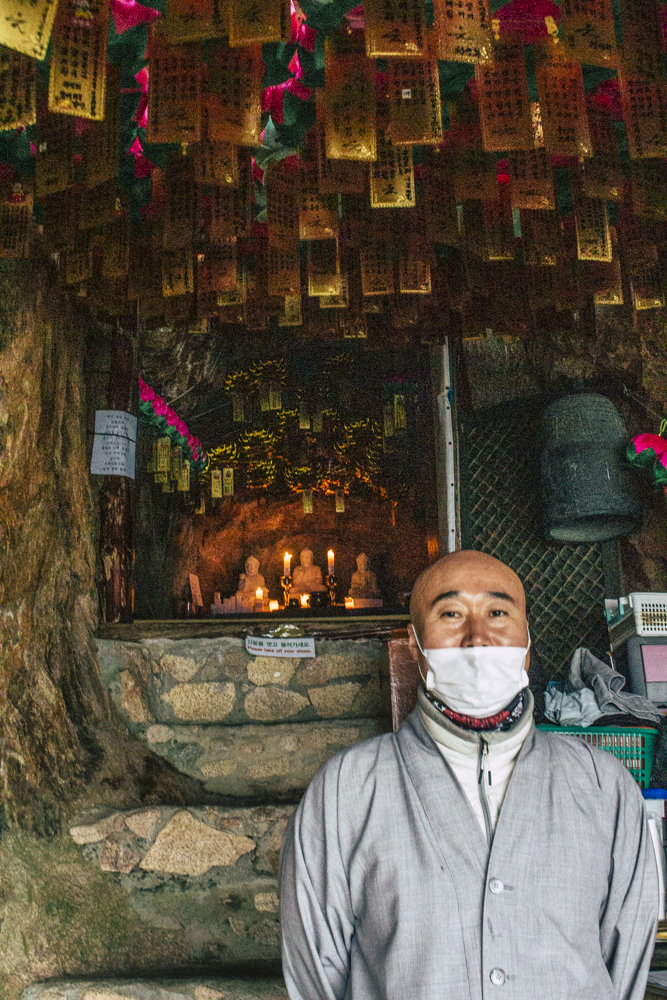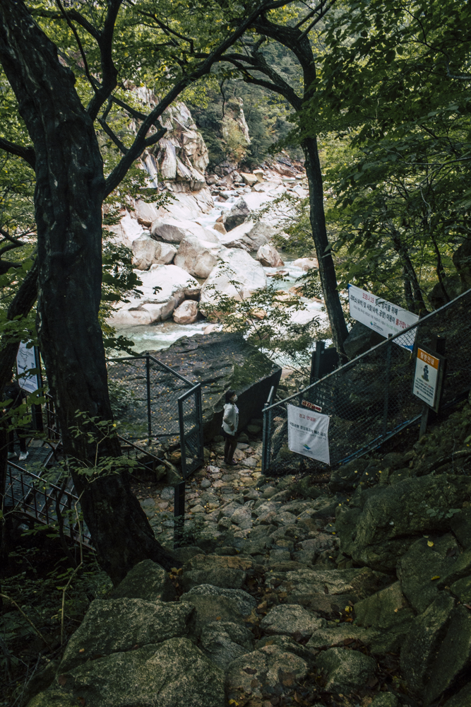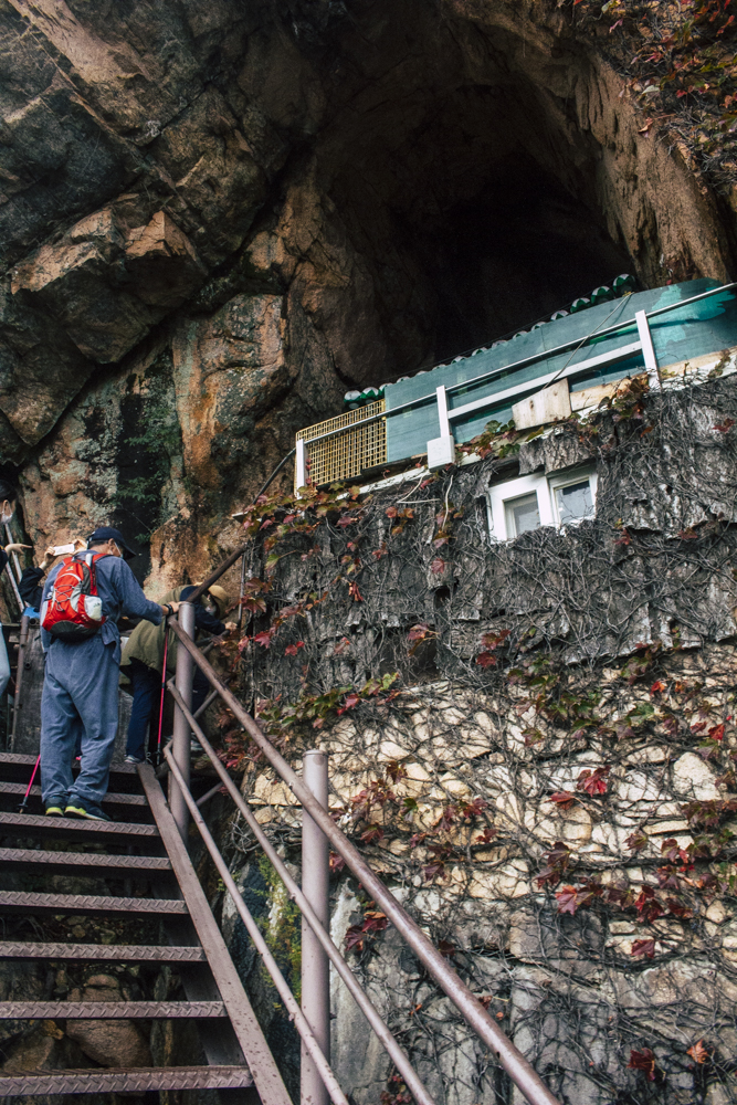 Day One was a three to four kilometer hike to Geumganggul Cave. Bisondae Rocks came first, a gathering of jagged rock towers that curve into a bubbling stream below. One rock, flat and inescapable, bears carved inscriptions in Chinese characters. I can’t translate but at least one source points to writers and poets of centuries past as the inscribers. Further along and atop a set of narrow orange stairs, I met a Korean couple from Bukhansan way. We exchanged coffee for cookies and took in the view, a steep climb to the cave above, a beautiful drop to the earth below. The monk supervising the cave was nearing the end of his “shift” by the time I’d arrived. He spoke some English and said he lived in Sinheungsa, the Seorak Buddhist temple I’d visit two days later. I commented that he must be healthy hiking to the cave every day. He said his upper body was, not so much the legs.