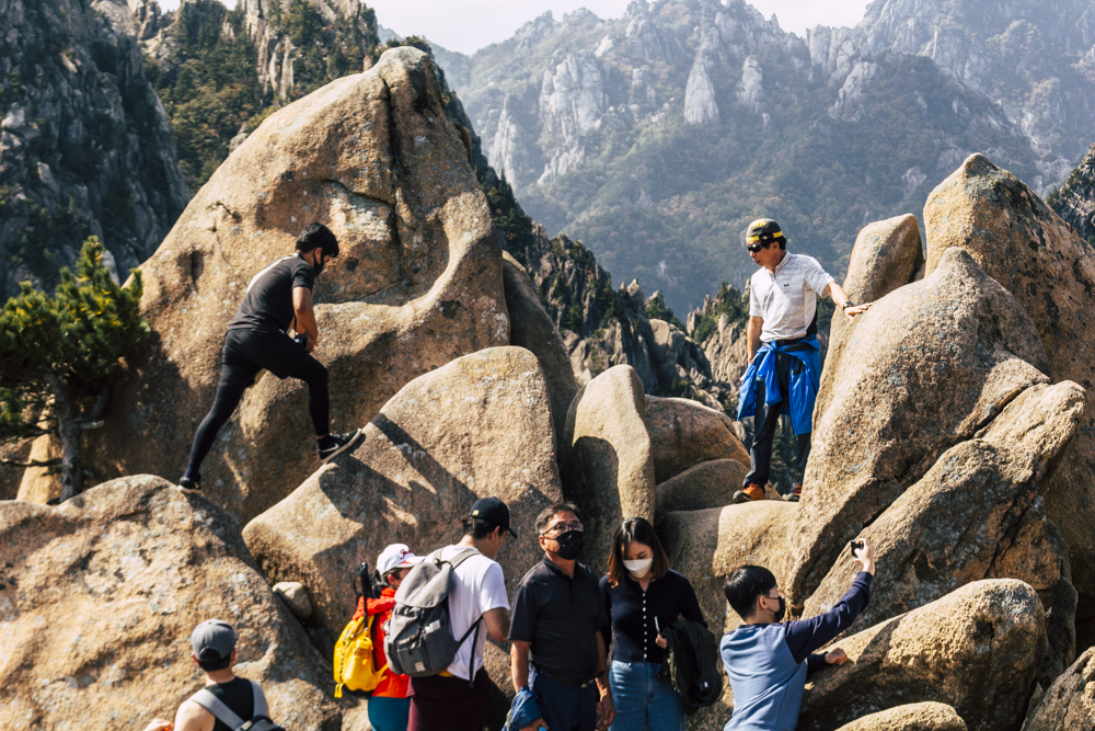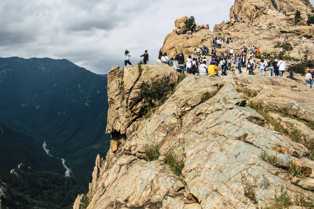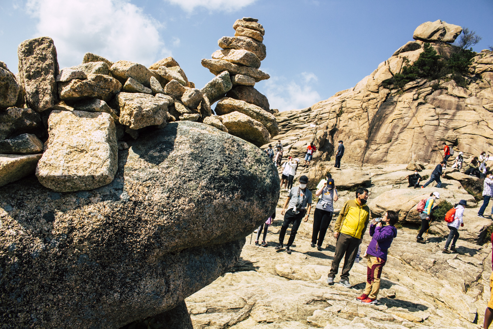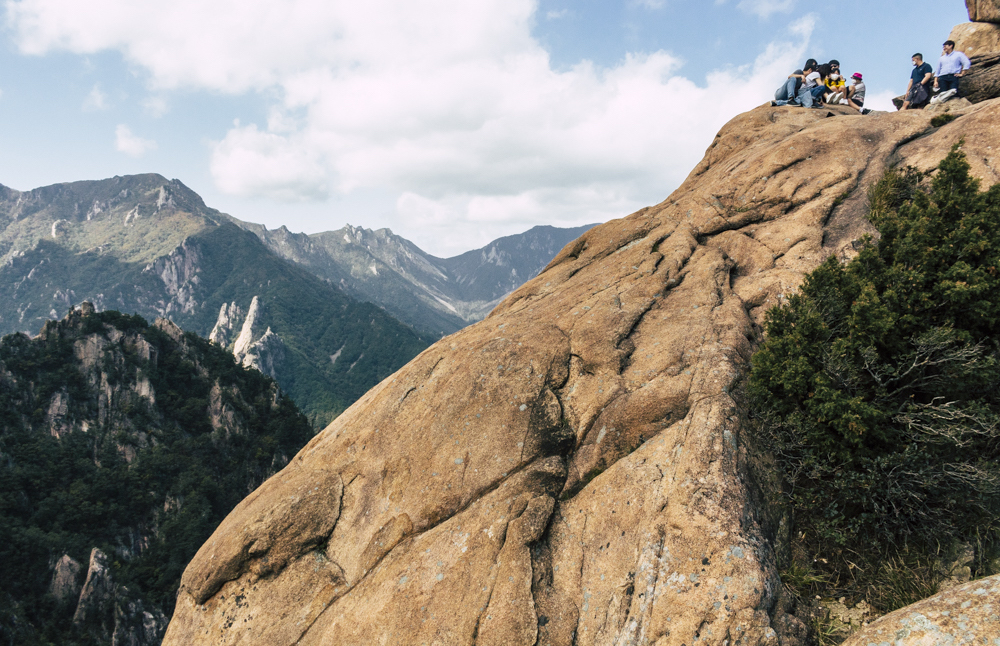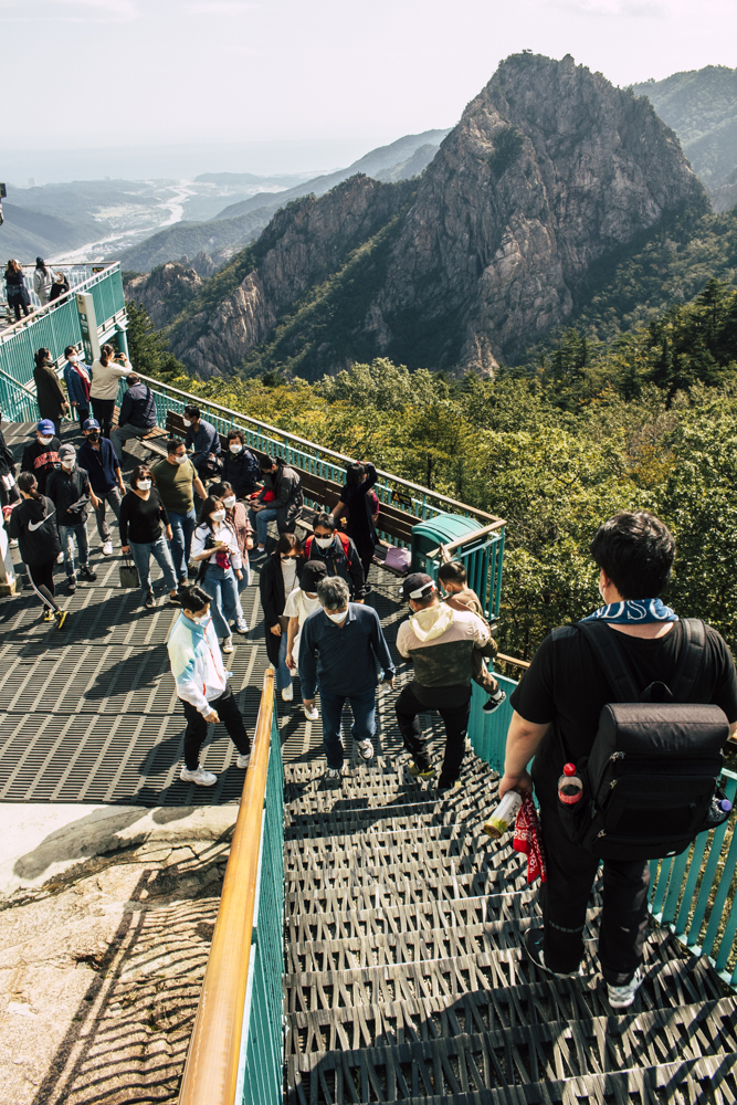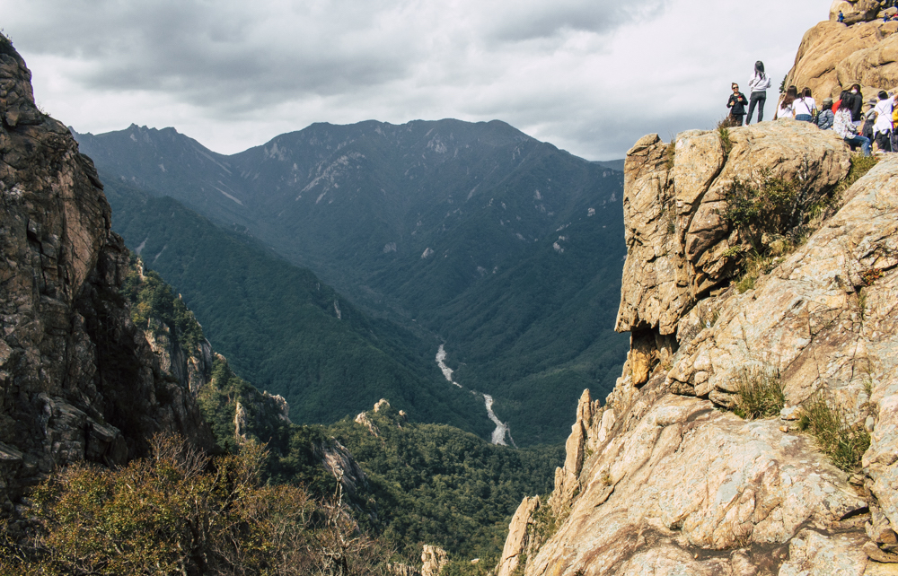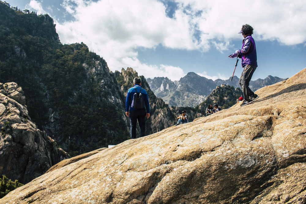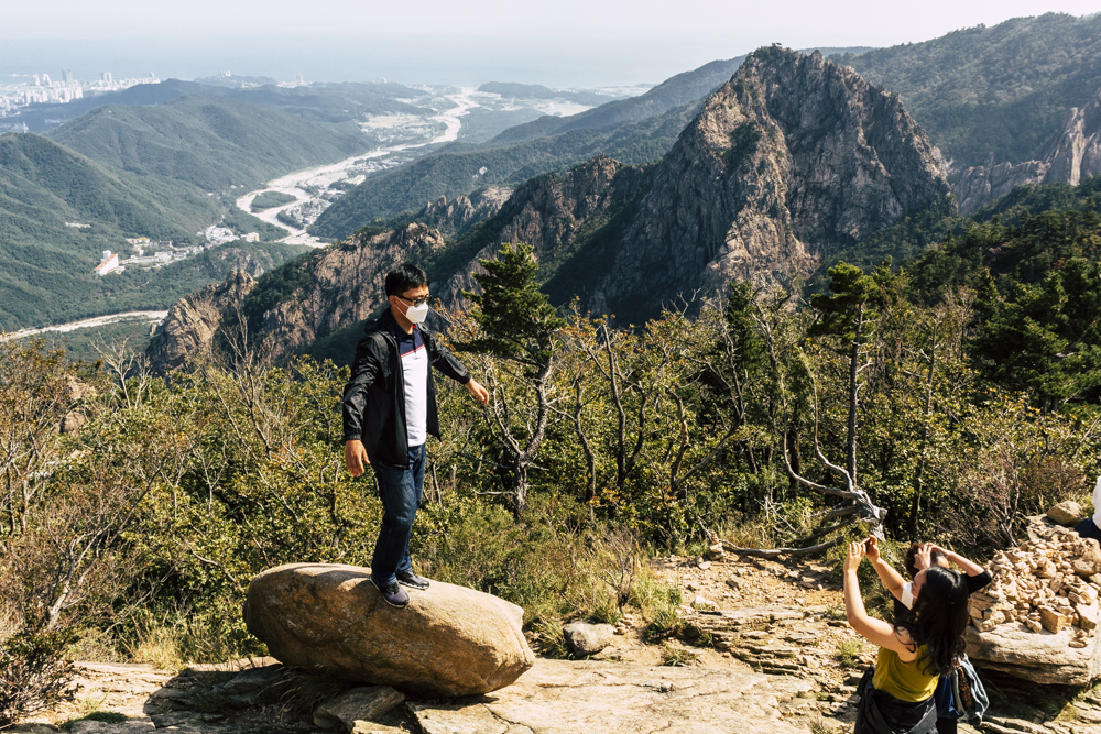 I caught up with two Busan friends and their mother/mother-in-law on Day Two, where the cable car climbs 670 meters up Seorak Mountain. Once you exit, it’s a simple walk to Gwongeumseong Fortress. Website after website mentions “fortress ruins,” which must cause confusion. If there are ruins of the 13th century Onggeumsan Castle, they must be in spirit I thought, or in the intentional way some of the rock formations are placed. (Afterwards online, I saw photos of very obvious sections of snaking stone wall, perhaps taken from the cable car.) What I did see were skyscraping views of treed valleys and distant Sokcho, atmospheric ravines and dozens of visitors playing the angles for their own homegrown photo-of-the-year. More than one complete stranger became the subject of some of my own pictures.