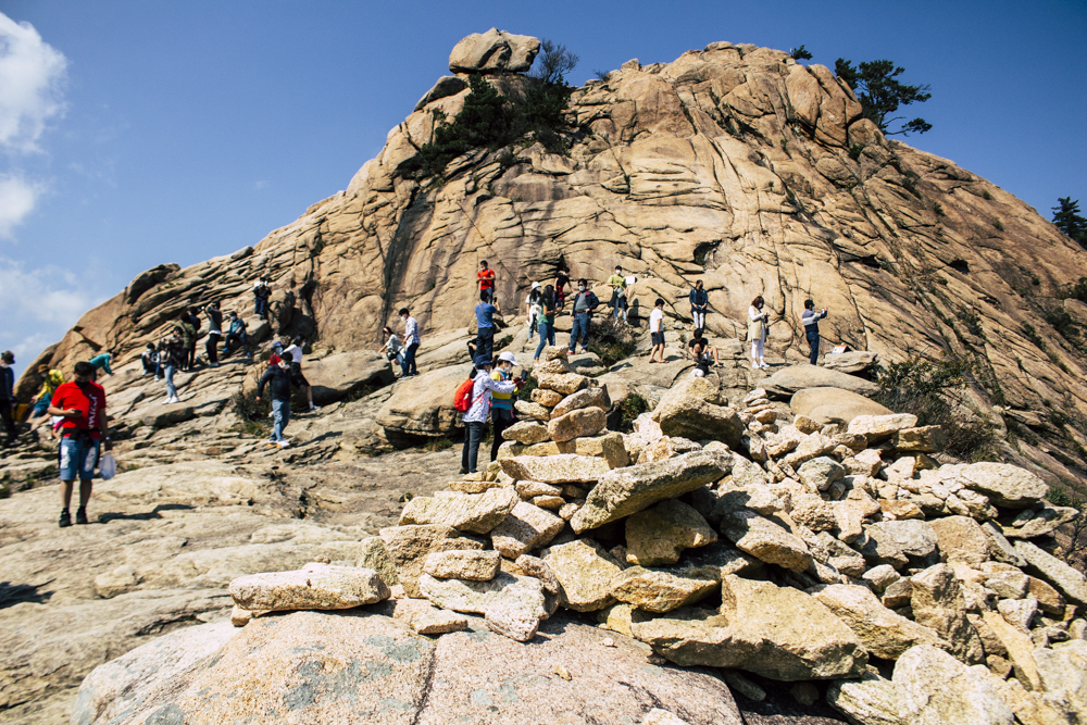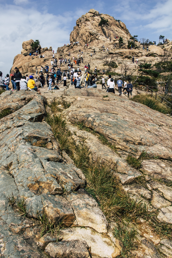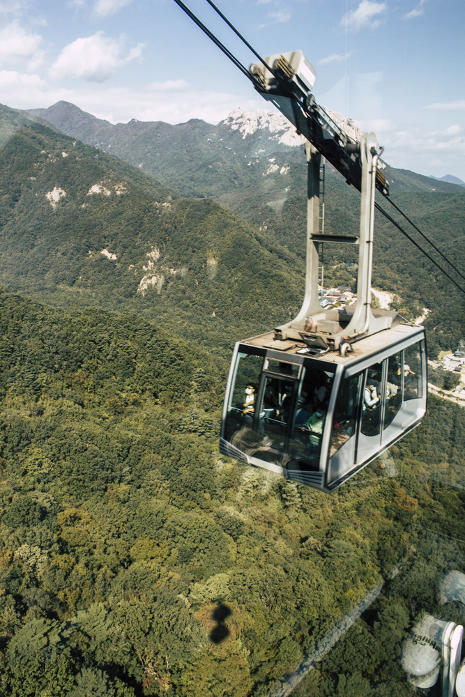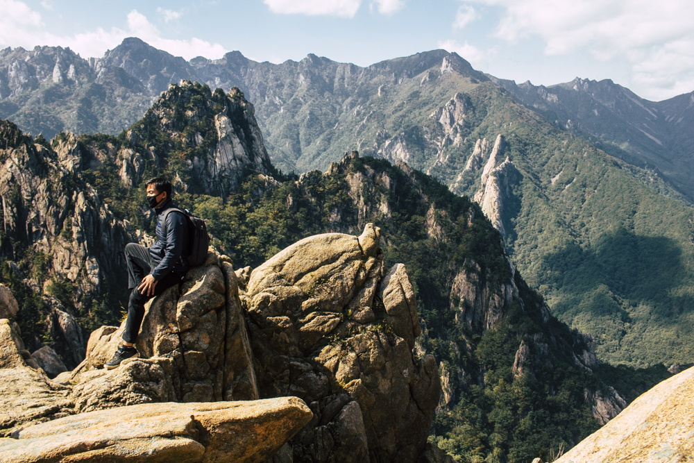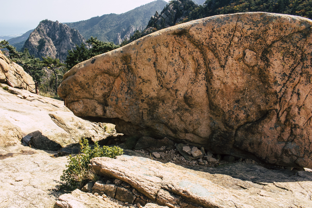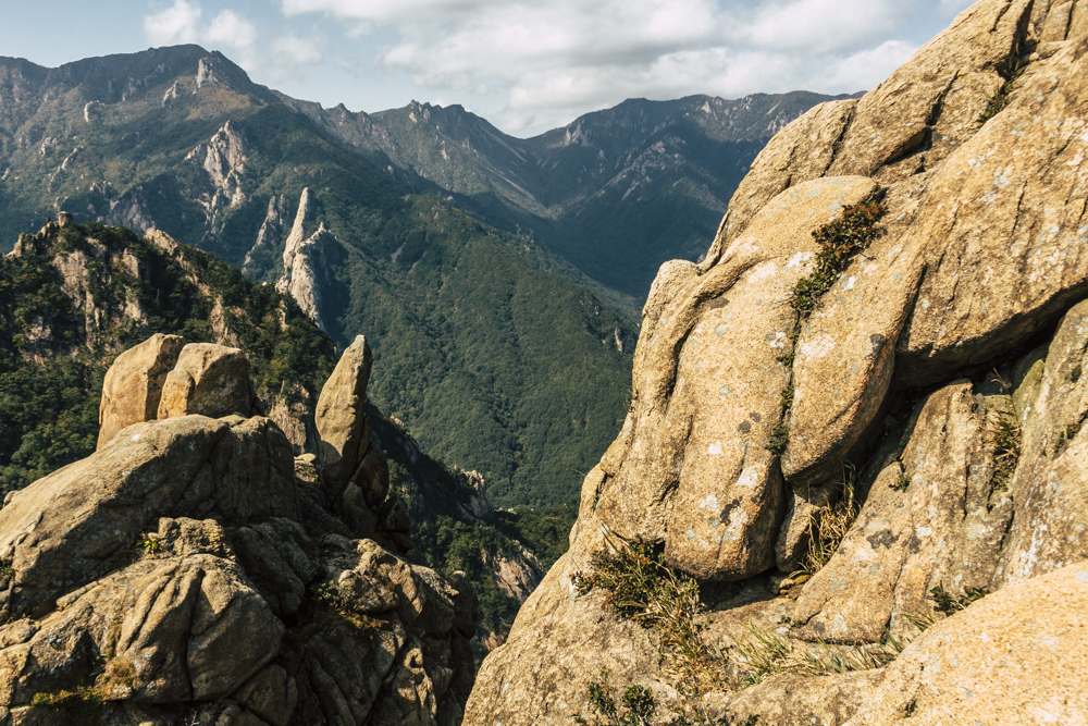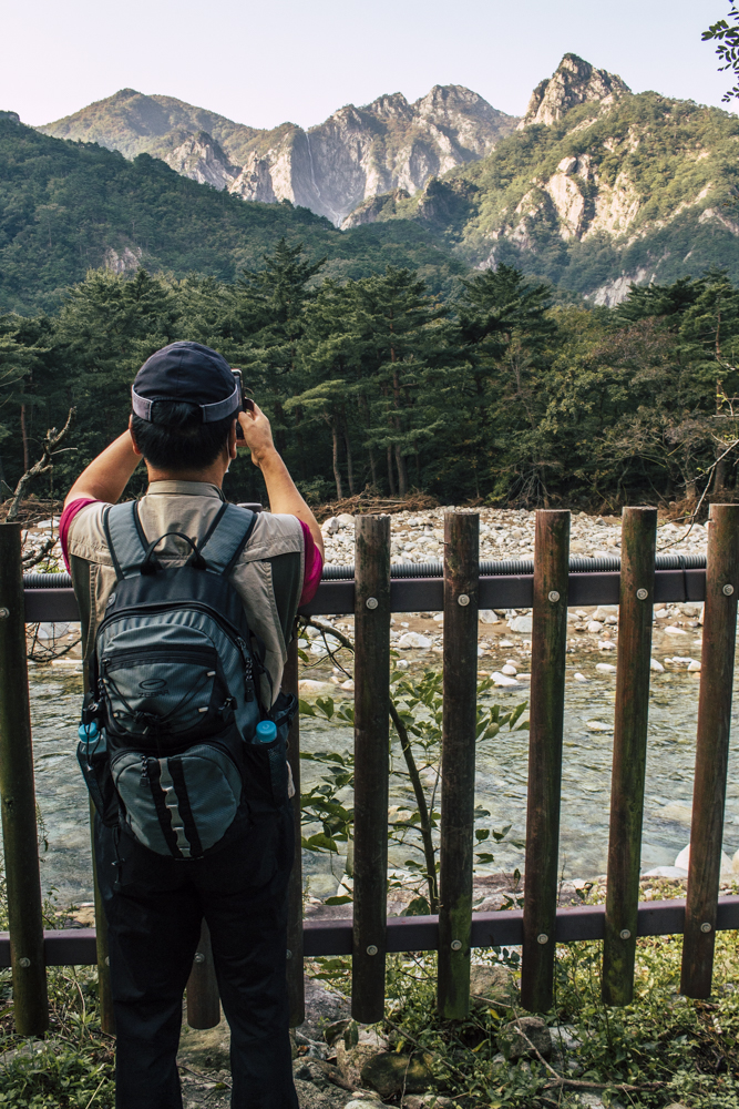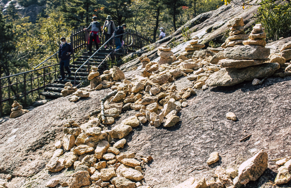 I caught up with two Busan friends and their mother/mother-in-law on Day Two, where the cable car climbs 670 meters up Seorak Mountain. Once you exit, it’s a simple walk to Gwongeumseong Fortress. Website after website mentions “fortress ruins,” which must cause confusion. If there are ruins of the 13th century Onggeumsan Castle, they must be in spirit I thought, or in the intentional way some of the rock formations are placed. (Afterwards online, I saw photos of very obvious sections of snaking stone wall, perhaps taken from the cable car.) What I did see were skyscraping views of treed valleys and distant Sokcho, atmospheric ravines and dozens of visitors playing the angles for their own homegrown photo-of-the-year. More than one complete stranger became the subject of some of my own pictures.