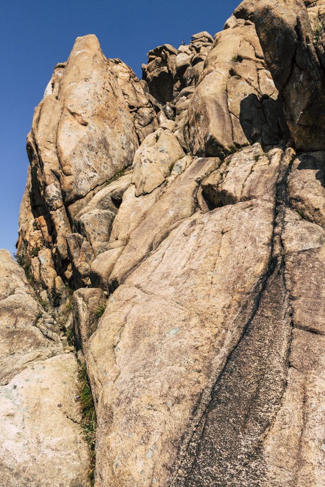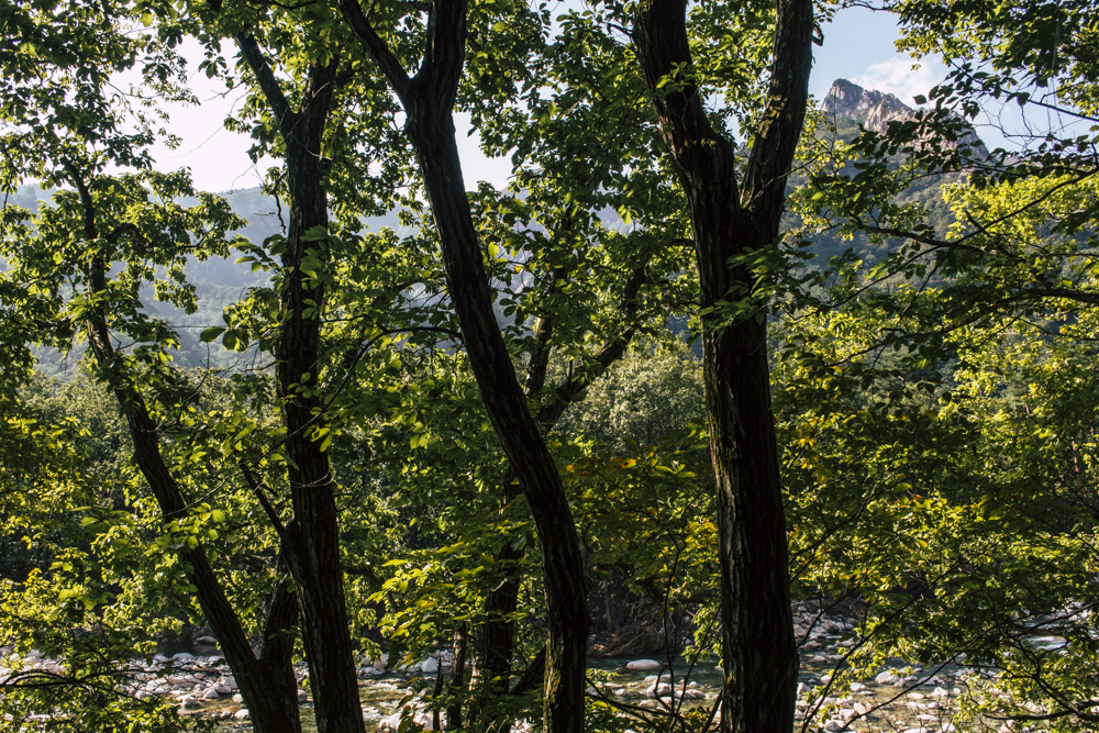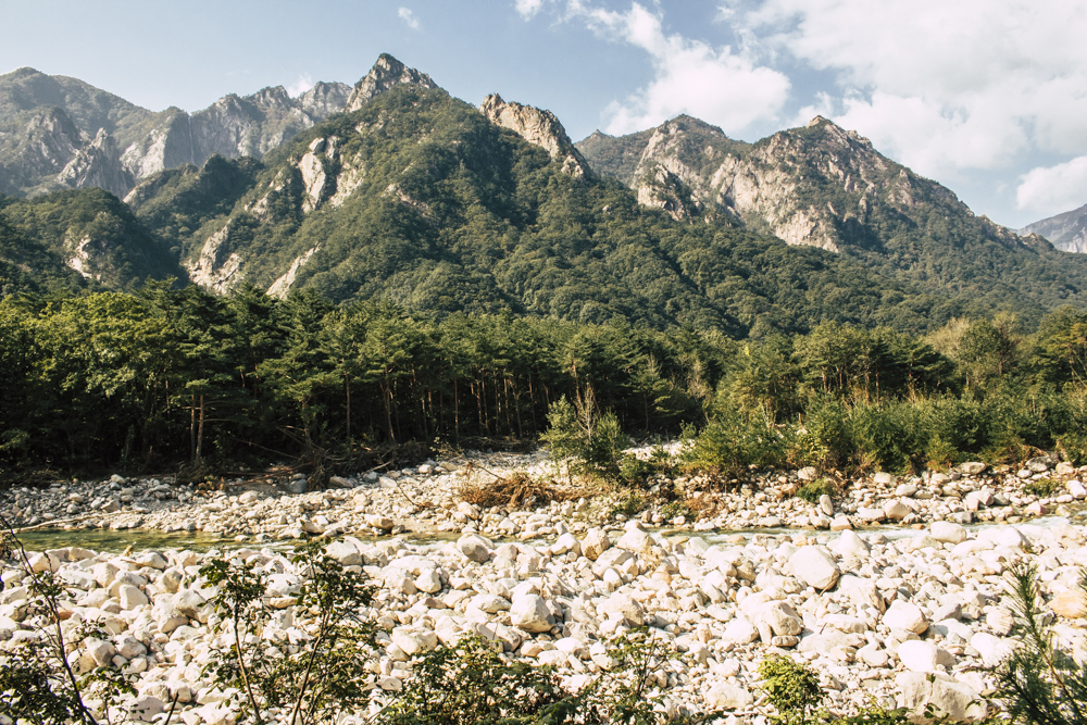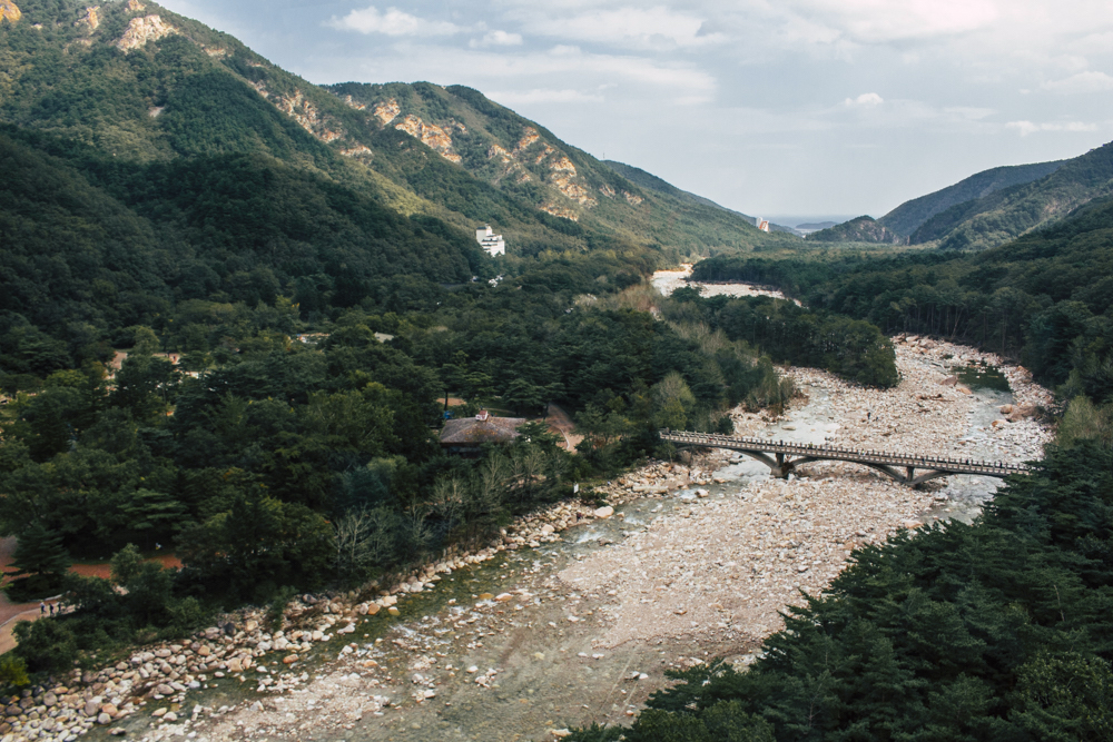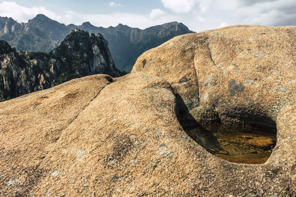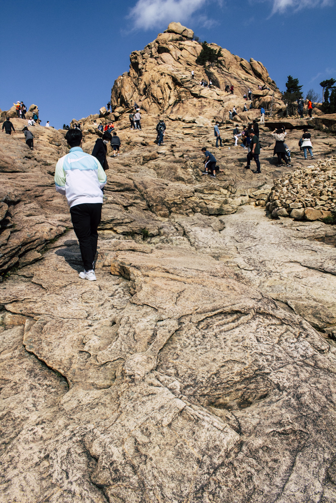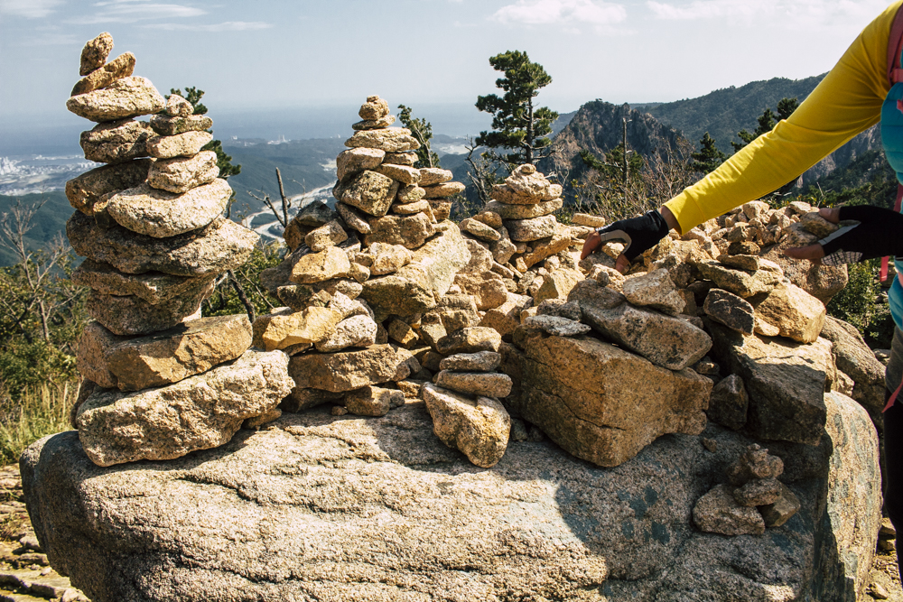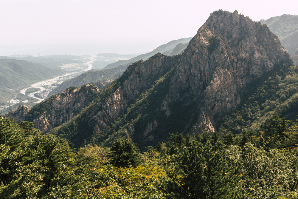 I caught up with two Busan friends and their mother/mother-in-law on Day Two, where the cable car climbs 670 meters up Seorak Mountain. Once you exit, it’s a simple walk to Gwongeumseong Fortress. Website after website mentions “fortress ruins,” which must cause confusion. If there are ruins of the 13th century Onggeumsan Castle, they must be in spirit I thought, or in the intentional way some of the rock formations are placed. (Afterwards online, I saw photos of very obvious sections of snaking stone wall, perhaps taken from the cable car.) What I did see were skyscraping views of treed valleys and distant Sokcho, atmospheric ravines and dozens of visitors playing the angles for their own homegrown photo-of-the-year. More than one complete stranger became the subject of some of my own pictures.