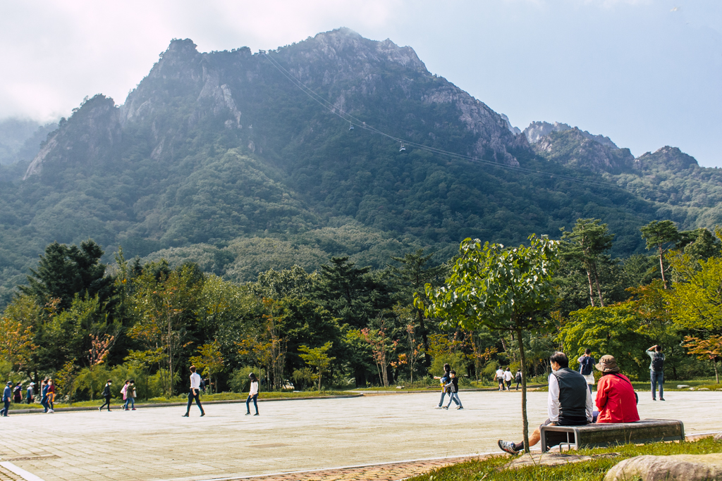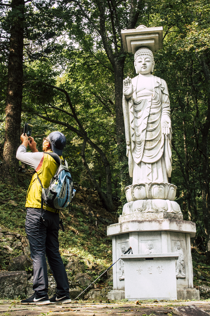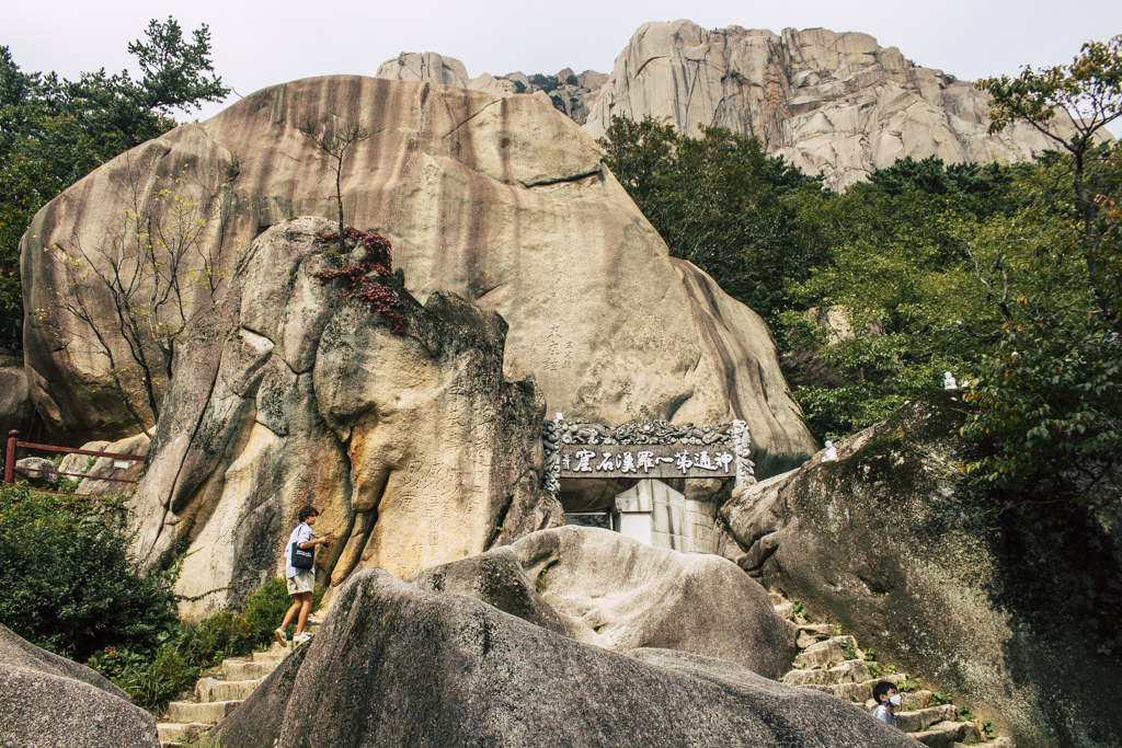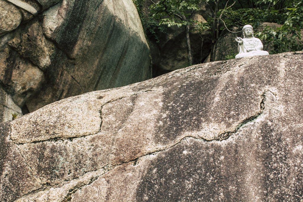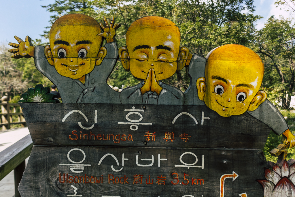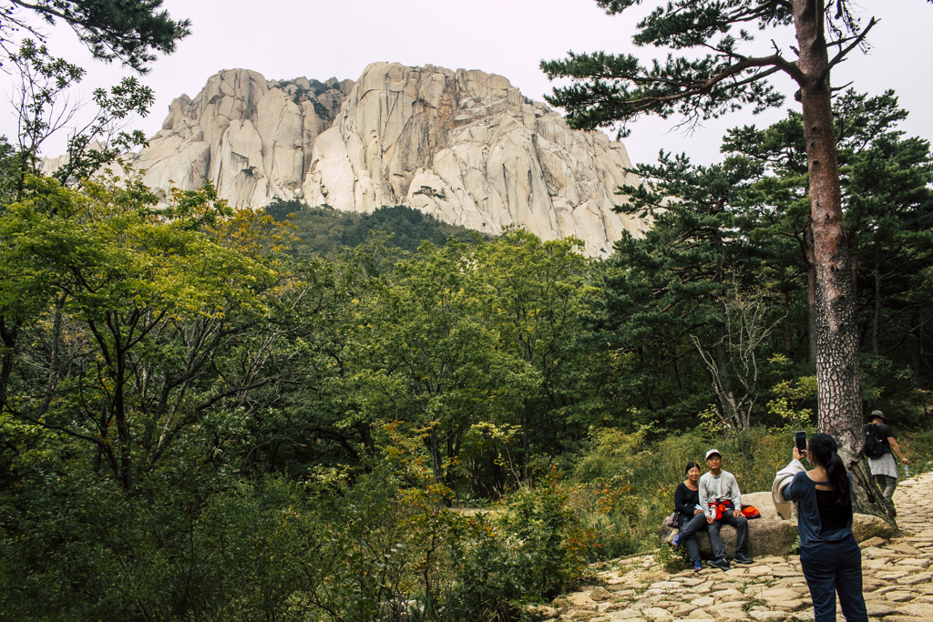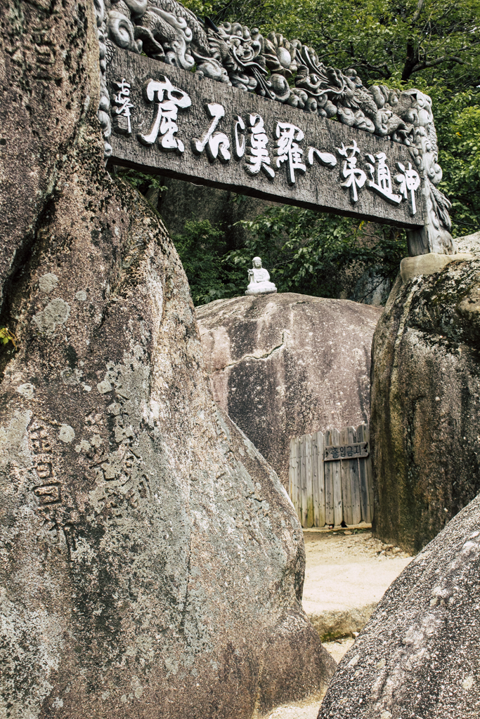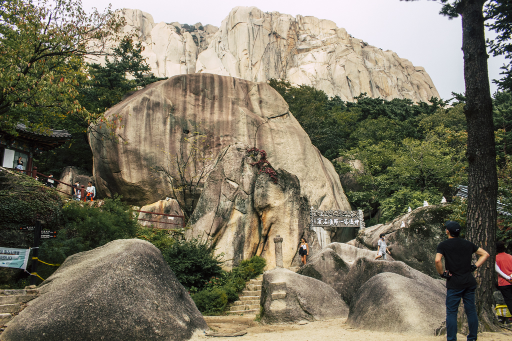 Day Three should have been more strenuous than it was. First I ambled through Sinheungsa, a Buddhist temple of the Jogye Order. The layout will be familiar to visitors of other Korean temples: the brilliantly fierce Four Heavenly Kings, the square inner courtyard and living quarters that flank it and the elevated main shrine hall. Under direct sun, the five-colored designs (“dancheong”) covering the pillars and wooden eaves almost glow. The plan from here was to continue on to Ulsanbawi (Ulsan Rock). This is the collection of granite finger peaks that along with Dinosaur Ridge so often advertise the park. The trail was muddy and slick in places but dried out in time. I eventually arrived at Heundeulbawi, an interesting site named for the boulder that is customary to try to roll though succeeding would surely end lives. Another Buddhist hermitage, Gyejoam, is uniquely placed at the scene with buildings and a shrine crouched within a mountain cave. After a look-see and some photos I sat gorging chocolate, an energy top-off. Then I backtracked. If there was a path that continued on to Ulsanbawi, I didn’t see it. If there was a sign (there was), I missed it. The fingers looked down from above and I took it as look, don’t touch. I’ll get ya next time.